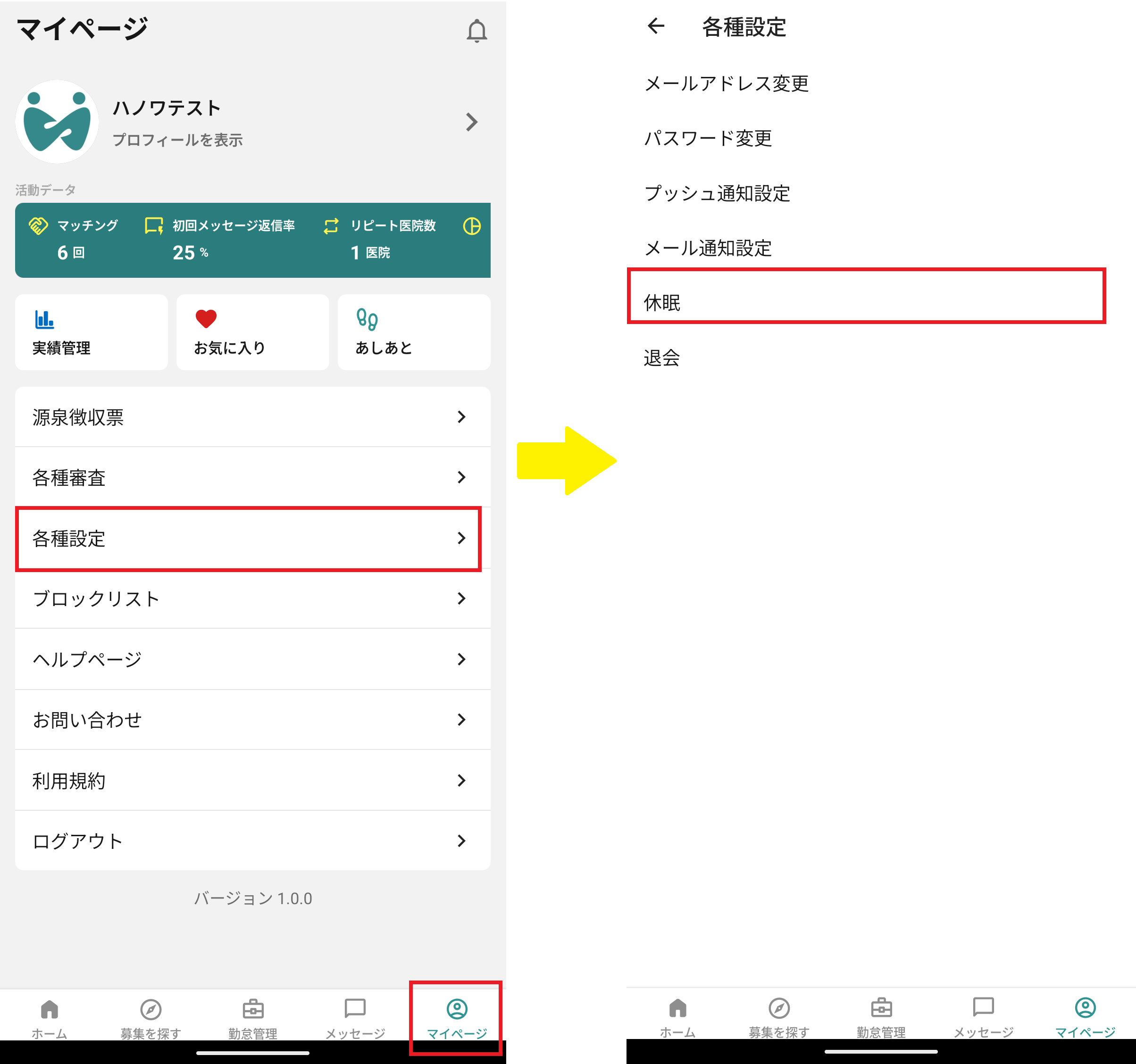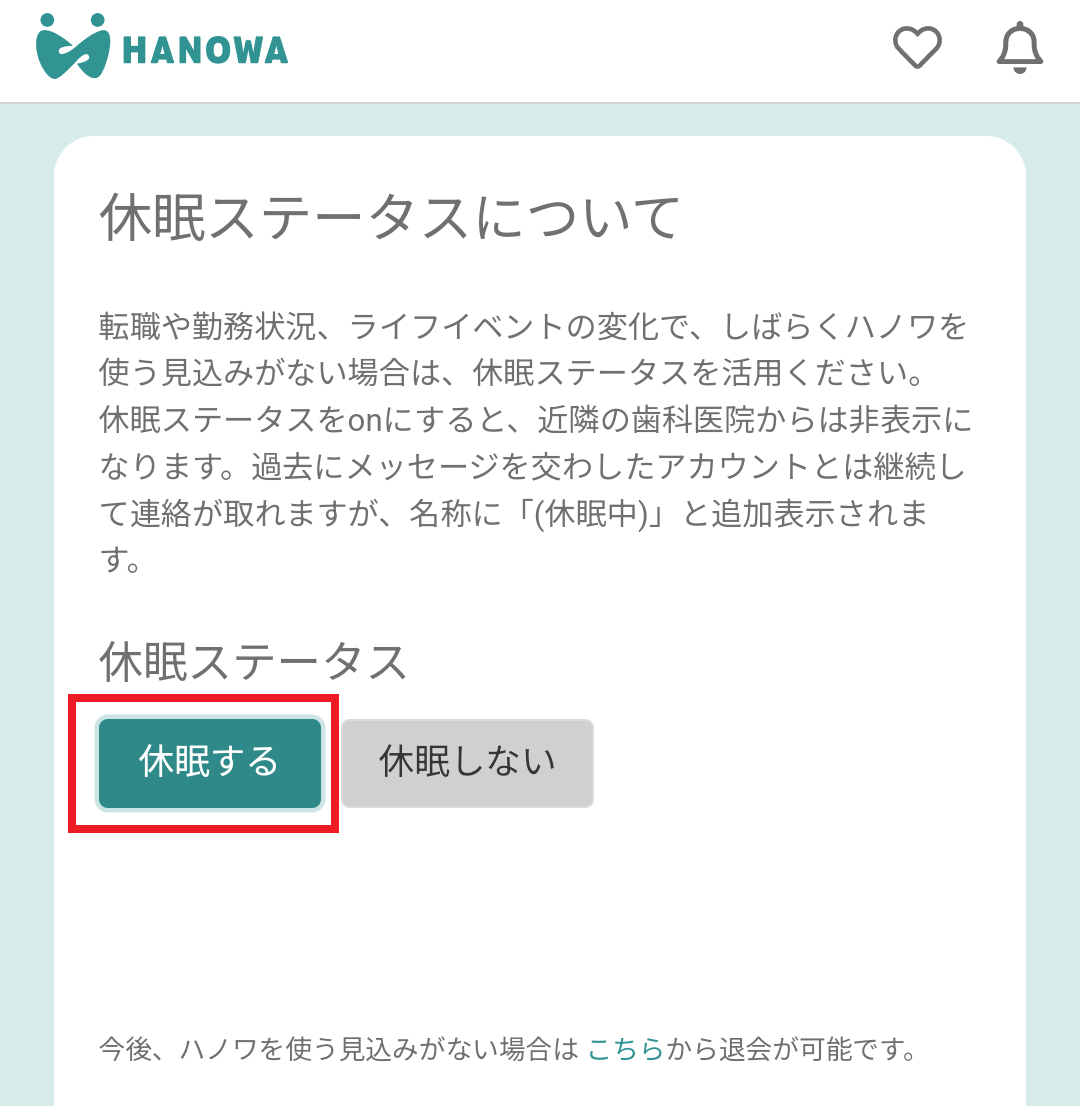 転職や勤務状況、ライフイベントの変化で、しばらくハノワを使う見込みがない場合は、休眠ステータスを活用ください。