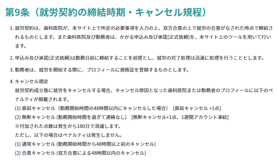 1.キャンセル規定の詳細はこちら ご利用規約(歯科医療従事者向け第9条(就労契約の締結時期・キャンセル規程))