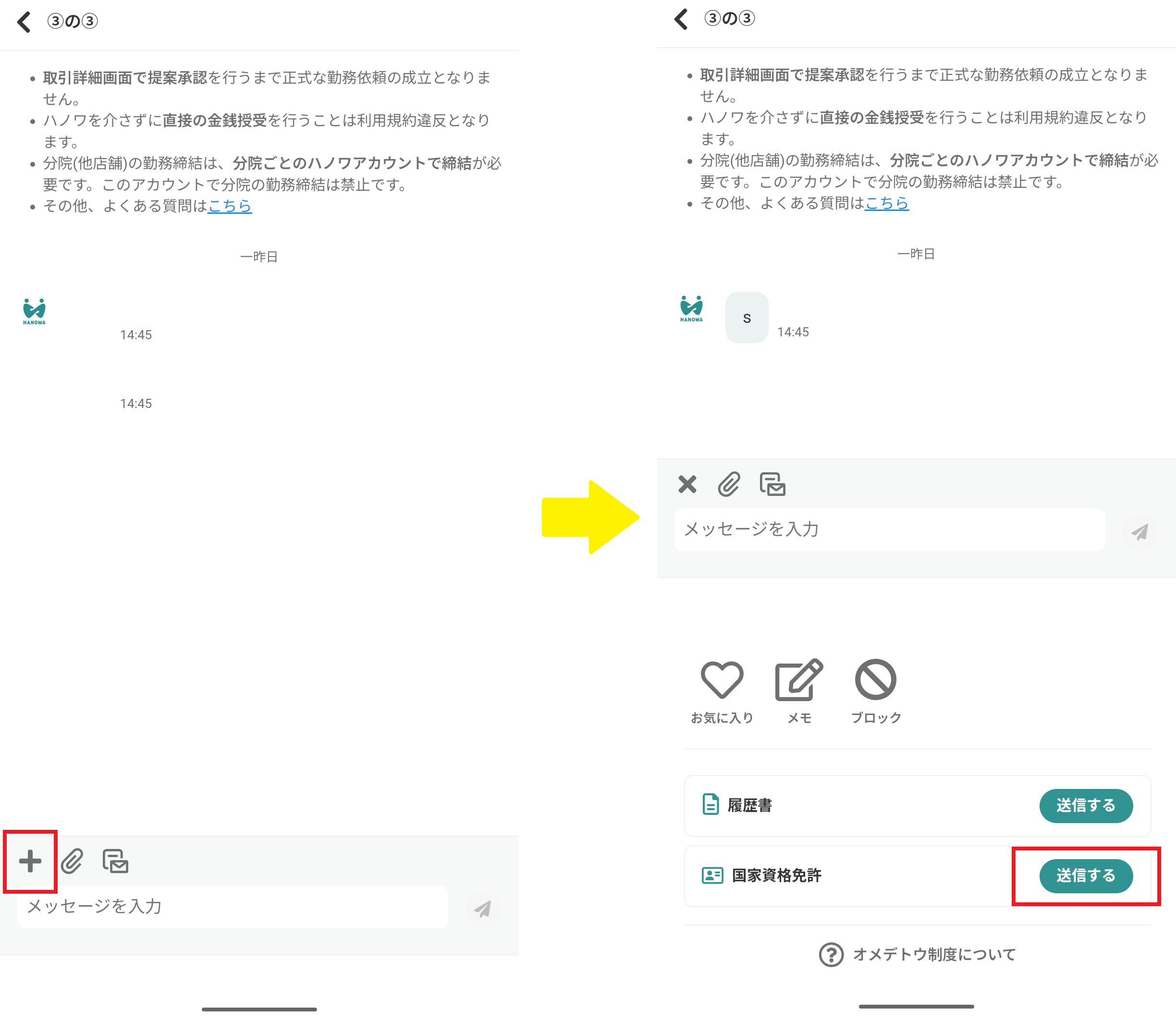 (1)「メッセージ」から国家資格免許を送付したい歯科医院のメッセージを開きます