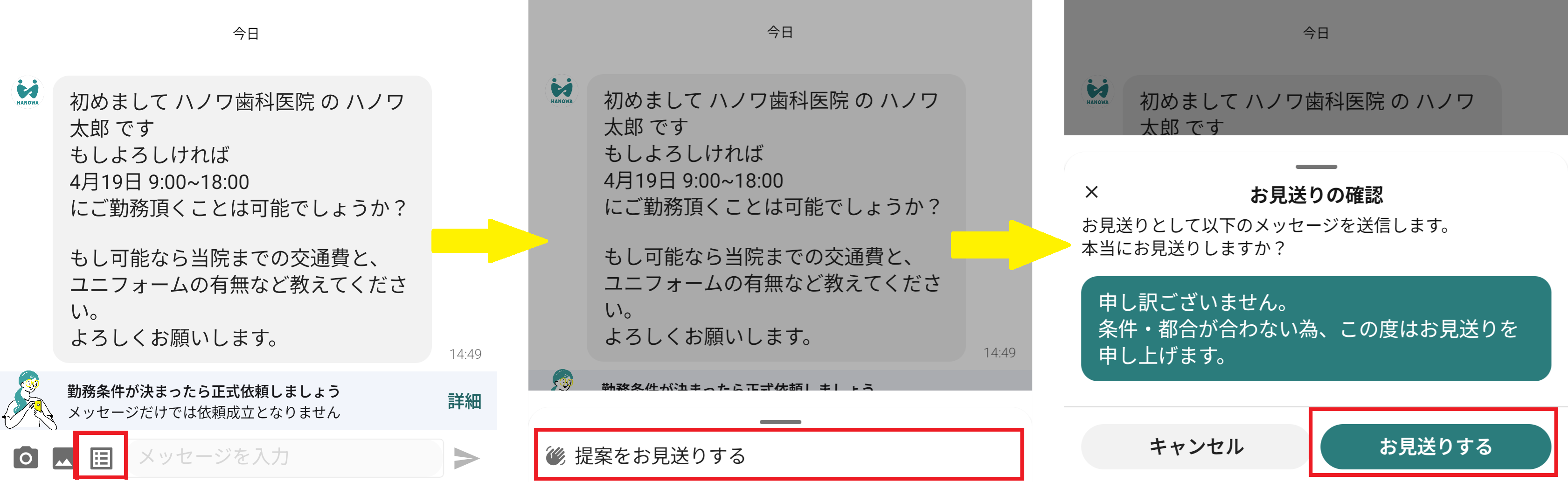 「提案をお見送りする」だけでは正式なキャンセルとはなりません。提案をお断りする際は、別途、予約・勤務のキャンセル手続きを行っていただく必要があります。
