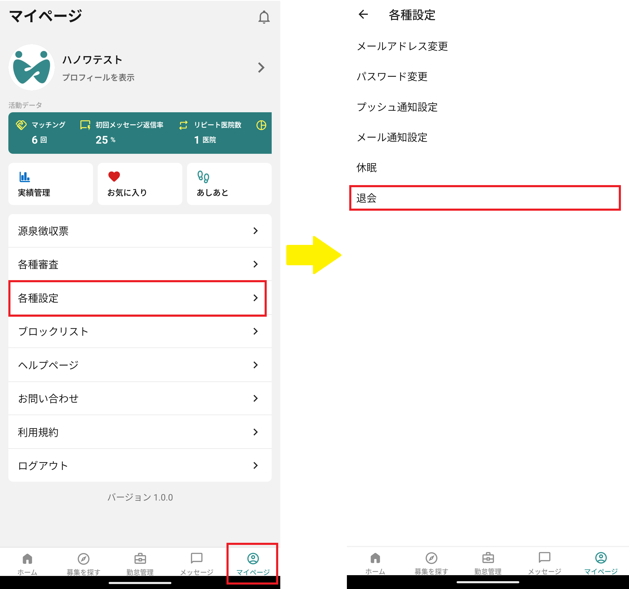 [マイページ]→[各種設定]→[退会]から退会処理が可能となっております。また、[退会]ページには下記のURLからもお入りいただけます。https://app.hanowa.net/ptr/profile/leavingService