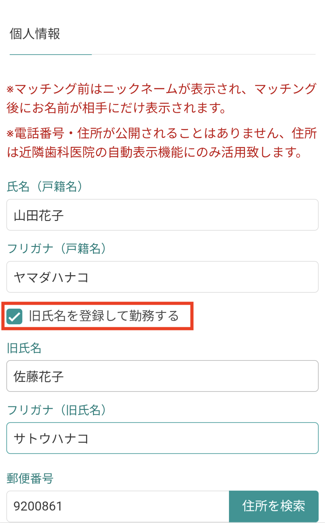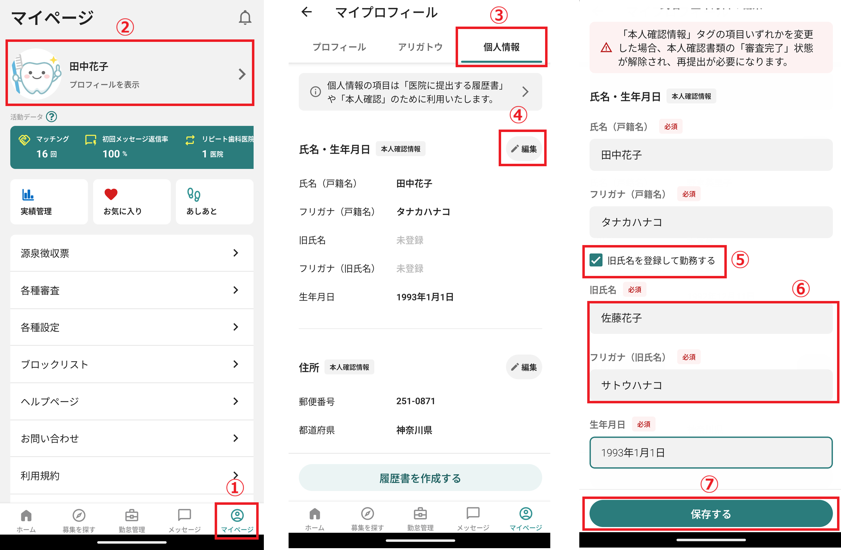 ③「旧氏名」と「フリガナ」を入力し、保存します。