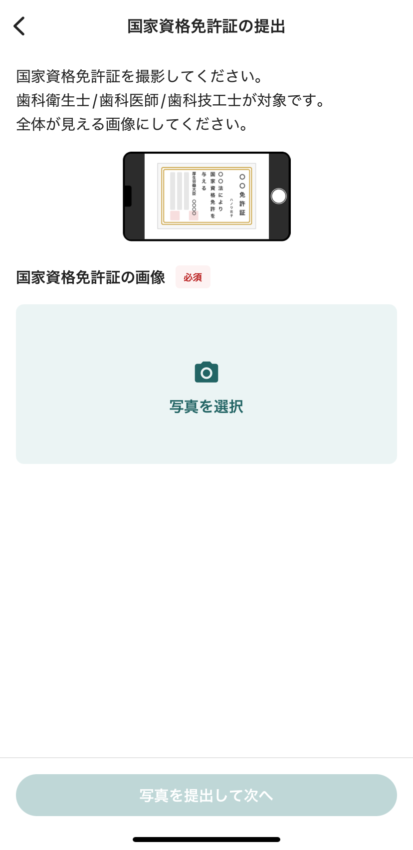国家資格免許(歯科衛生士/歯科医師/歯科技工士)の写真をご提出ください。