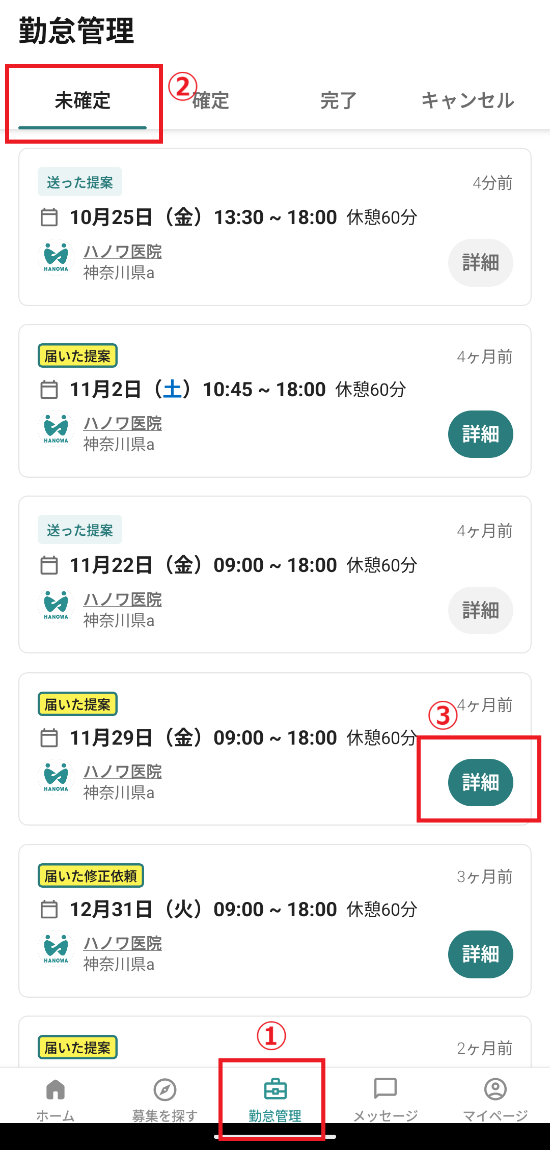 キャンセルしたい案件が「未確定」タブにあることを確認します。